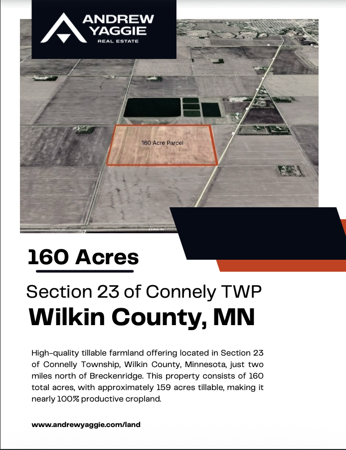 High-quality tillable farmland offering located in Section 23 of Connelly Township, Wilkin County, Minnesota, just two miles north of Breckenridge. This property consists of 160 total acres, with approximately 159 acres tillable, making it nearly 100% productive cropland.